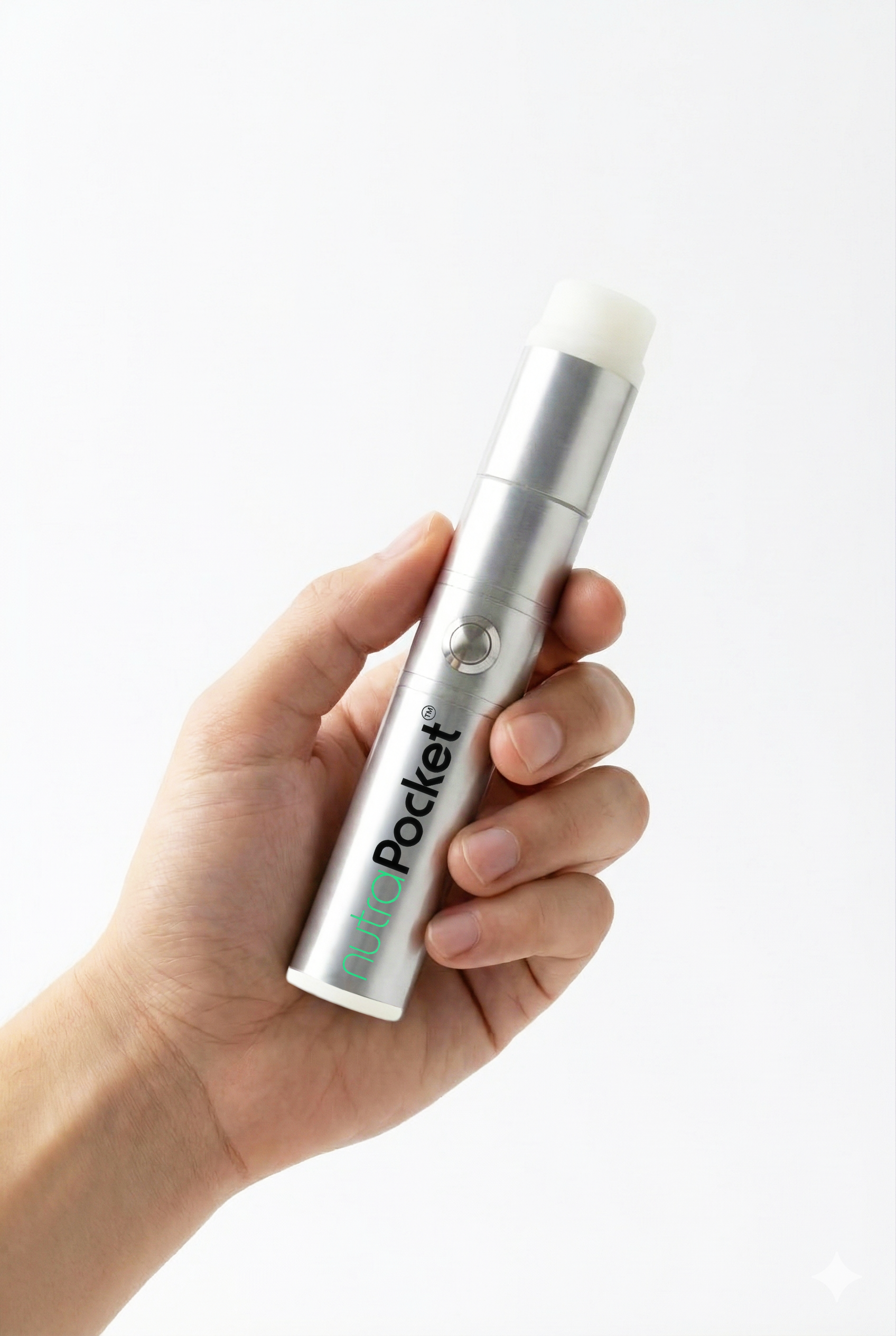 This handheld, compact halogenerator micronizes HNT’s proprietary compounds into perfectly sized inhalable particles- no heat, no additives or liquids and no waste. Engineered for targeted effectiveness and reliability, Nutrapocket makes HaloNutraTherapy(HNT) accessible both at home and in professional wellness settings.